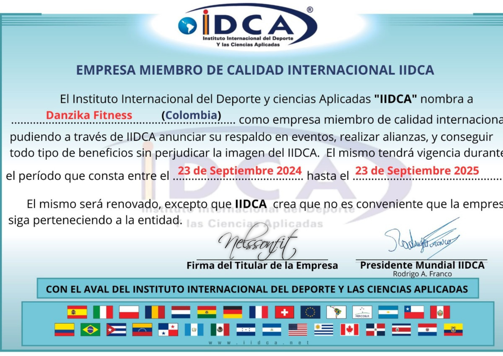 A partir de septiembre Las marcas Dnzika fitness, Danztep fitness, Match21 funcional y Step fit funcional Estn acrditadas, por el Instituto Internacional de Deportes y Ciencias Aplicadas IIDCA, para ser certificadores en educacin continua y ser miembros de comite inter-disciplinario IIDCA para certificar profesores avalados por est institucin.